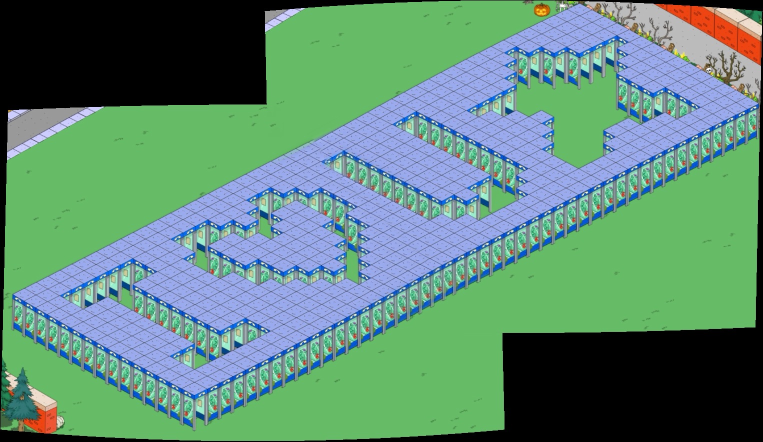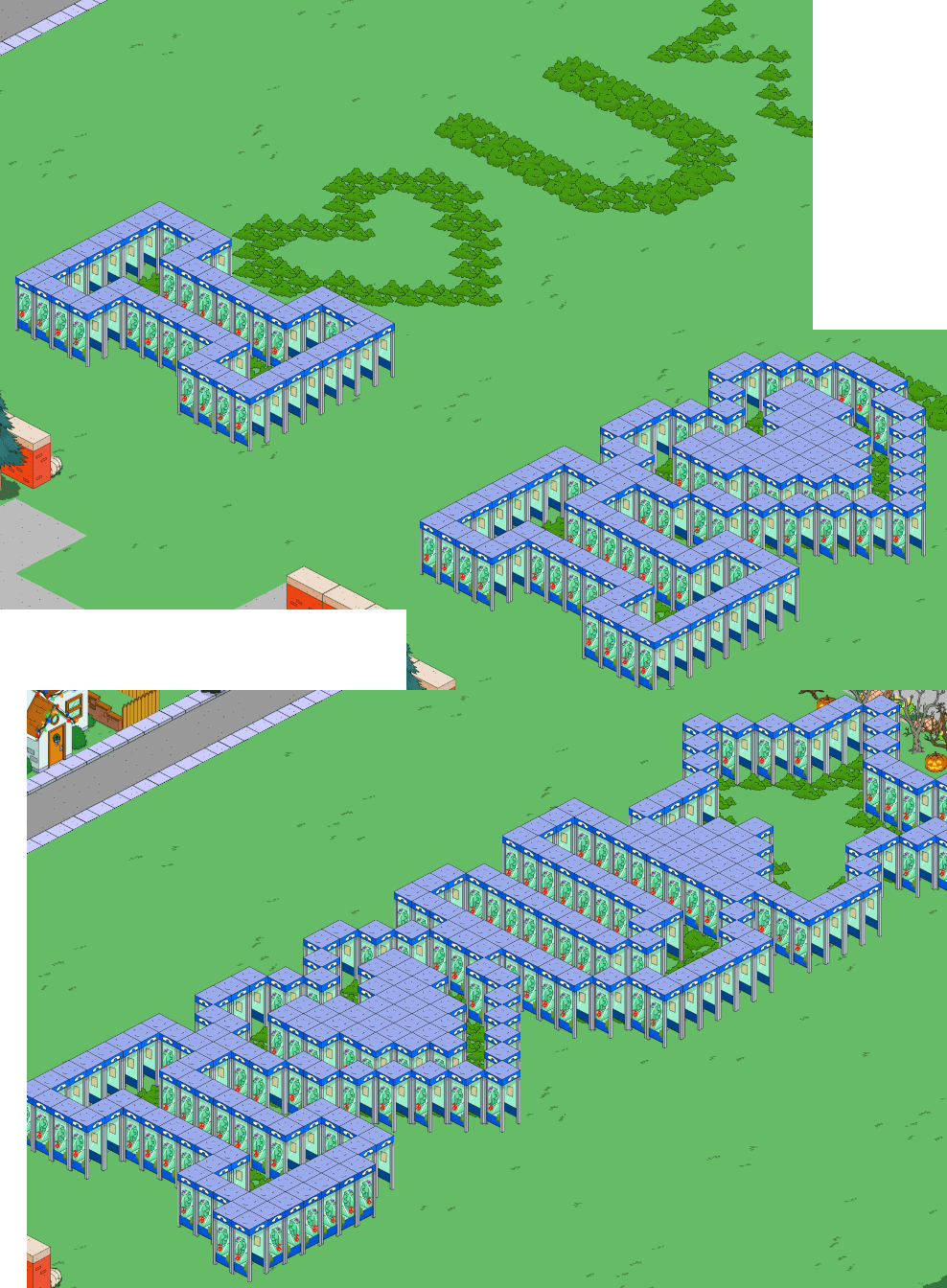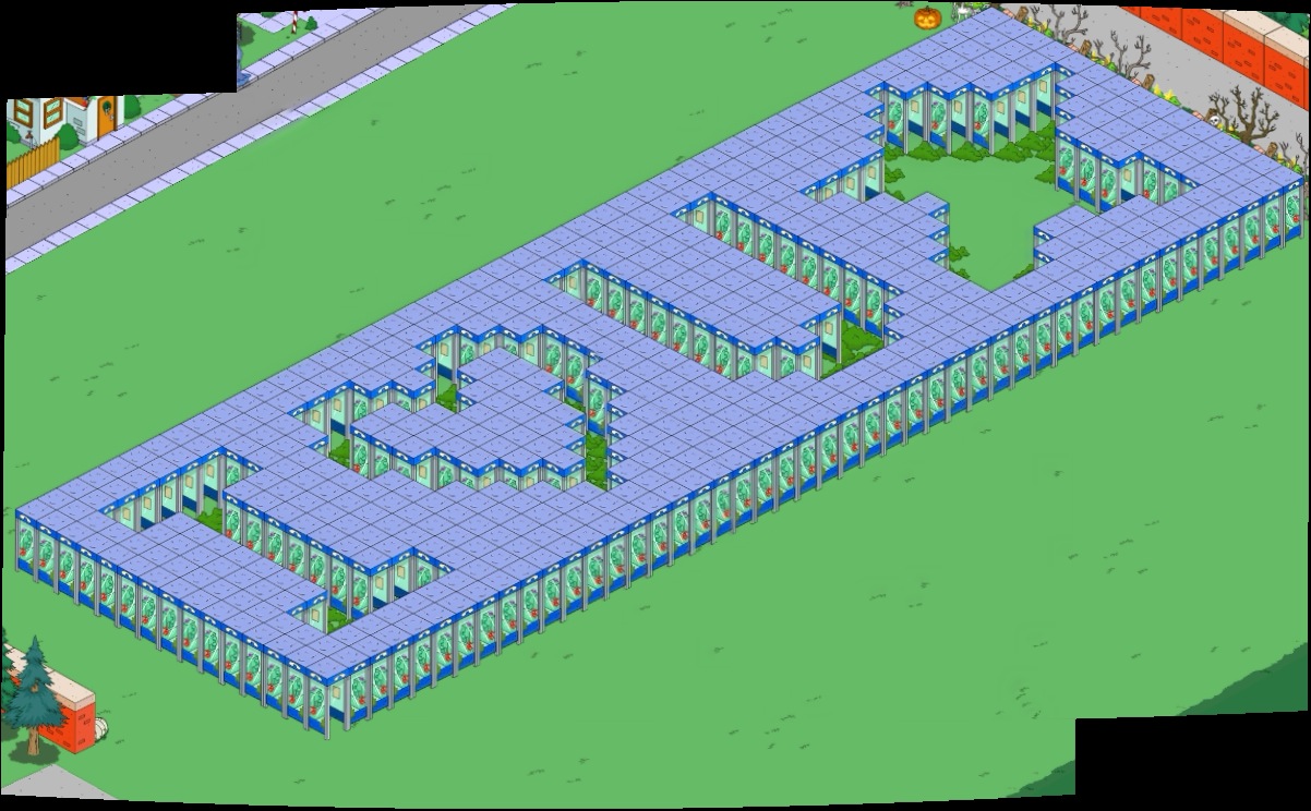 The blob was a booger to do but I like what I came up with. It’s a combination of $25 and $70 shrubs. To do something a little different, I used the $1200 phone booths to outline the letters.