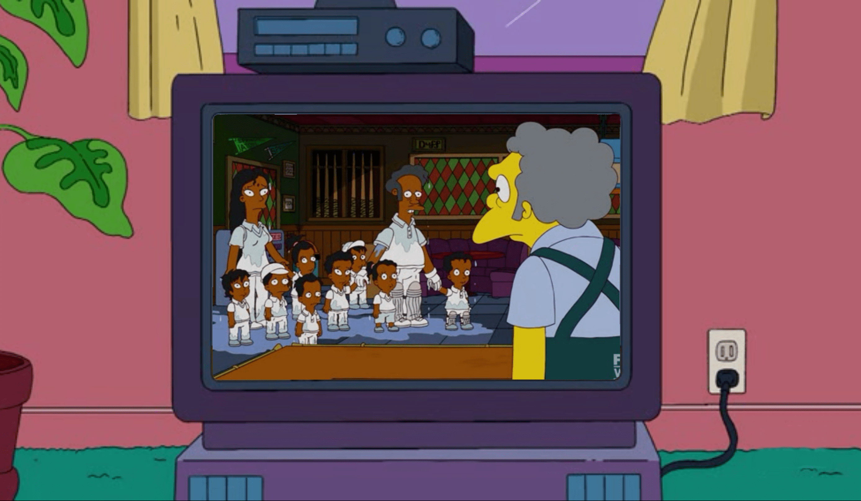 But how? Well it probably had something to do with everyone sneaking Manjula fertility drugs during the time she was trying to get pregnant including herself. Homer, Marge, Apu,…BART??!! Due to the amount of kids, they are celebrated and showered with help and free gifts from around the world. But then some Shelbyville woman had to go and have NINE babies. All the help and free stuff was gone in a blink of an eye.  They are exhausted from taking care of the babies. (You can see Apu “feeding” them in this episode like in his task.) Larry Kidkill from the Zoo shows up on their door and tells Apu to come with him. He wants to offer Apu a way to have the kids live in “luxury” and take them off his hands. “They’ll have the best of care.” Apu and Manjula decide to give it a try. It seems great at first, but the parents are pushed out and the kids turned into a side show for the crowd. Apu and Manjula are upset and try to take the babies back home. They are thrown out of the Zoo and may never see their kids again. Apu takes the law into his own hands and breaks back into the Zoo with Homer to take them back. The Zoo owner follows them back to the Simpsons. Homer offers himself in the Octuplets place for the show at the Zoo.