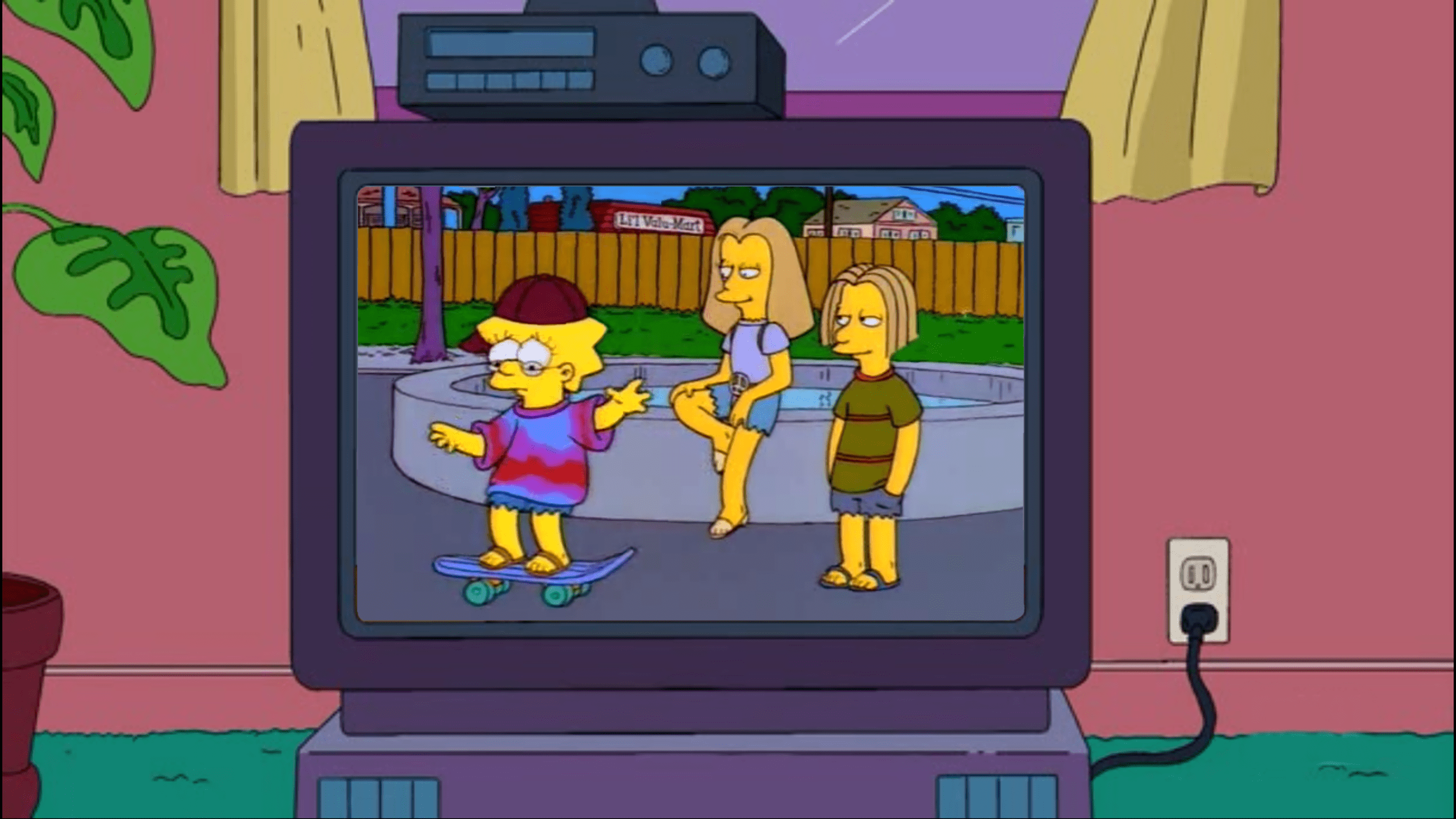 Noticing they have skateboards and hearing them moan they have no where else they can skate, she leads them to the one place they could skate that’s practically abandoned… the Library. Lisa attempts to skateboard with the new group of “cool kids”. Bart of course is irritated at the attention Lisa is trying to get and he tries to showoff and get their attention instead, but fails miserably.