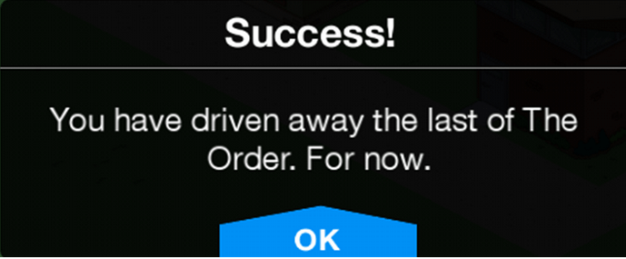 Also, note that the robed figures are spies.  So they’re sneaky and quick.  They run around your town and disappear and reappear, so they may be hard to spot and catch.  When you’ve collected all that are in your town you’ll get a popup that says you’ve cleared them for now: