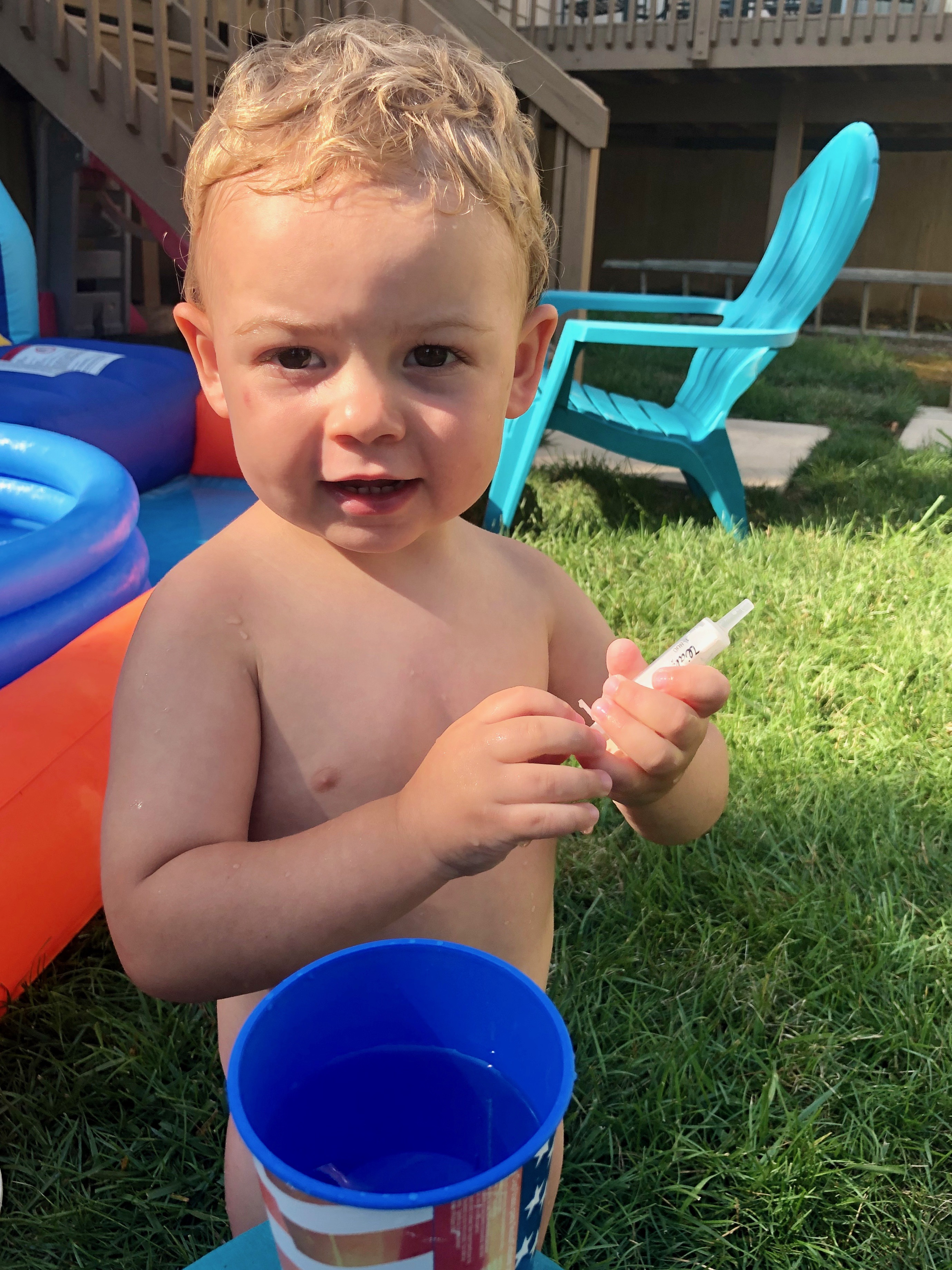 Jake…beating the 96 degree/80% humidity heat…by practicing his “syringe squirting” on Boopah!