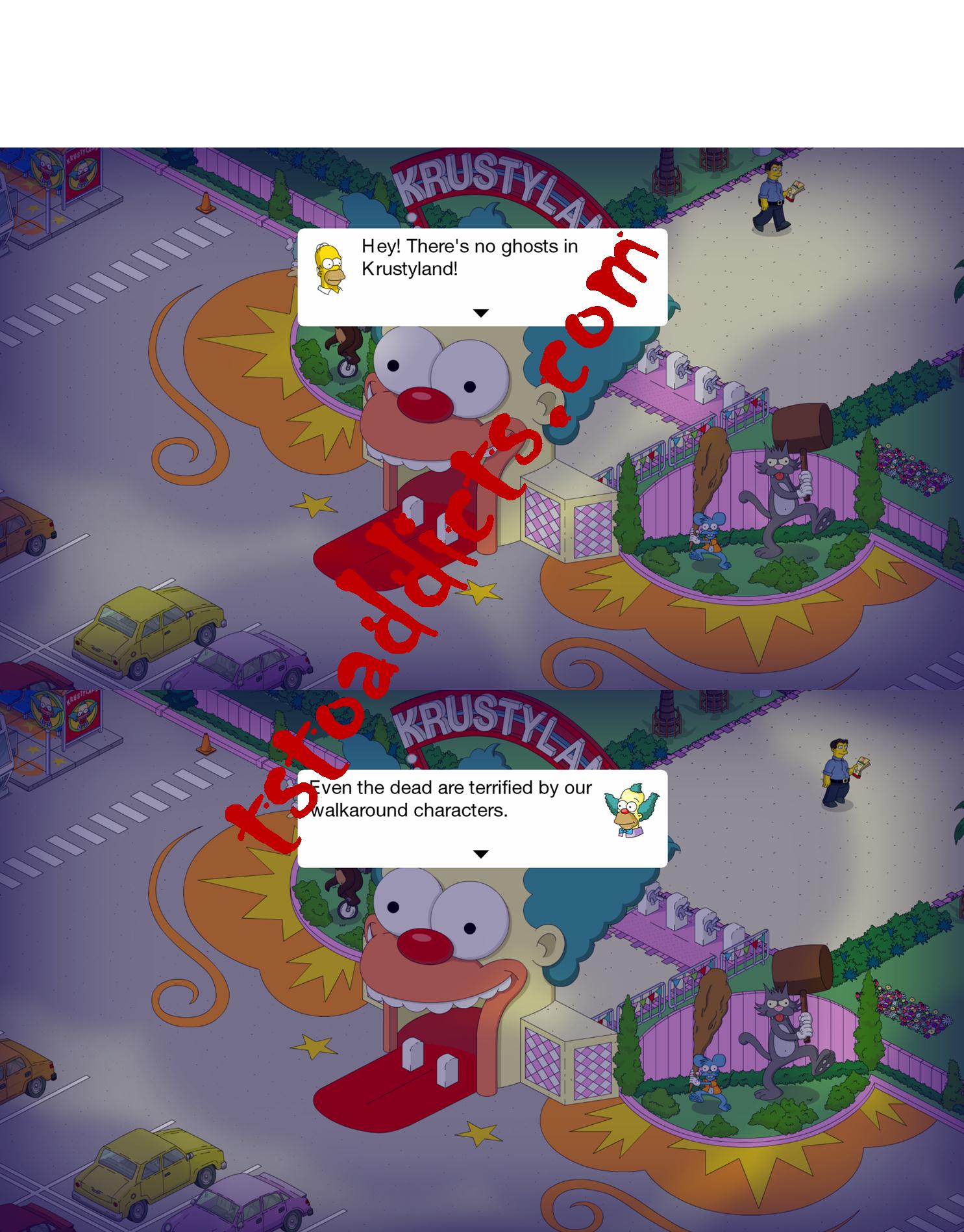 Literally. BOO! I was REALLY hoping for yet another EA treat. I was hoping that my Krustyland would be haunted as well. Can you imagine ghosts riding on the Tooth Chipper? Or better yet, pulling riders OFF the rides? So many funny lil devilish things they could’ve done. Not to mention the Gremlins pulling the rides apart piece by piece. Alas, I will just have to keep this one as well in my own lil head world of imagination.